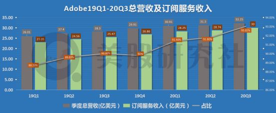 从图表数据上可以看出,Adobe本季度总营收的增长主要靠订阅服务拉动上涨。本季度,订阅服务收入为30亿美元,占总营收的比重为93.02%。其实订阅服务收入一直是Adobe营收结构中的最重要组成部分,也是拉动其营收增长的最重要驱动力。