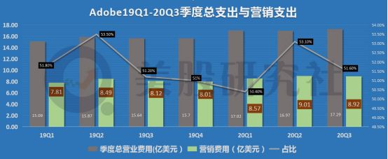 本季度,Adobe的总运营成本为17.29亿美元,其中营销成本的支出为8.92亿美元,占总运营费用的比重为51.6%。上图显示,近7个季度以来,营销费用占总营业成本的比例一直维持在50%左右,这一比重是相当高的。