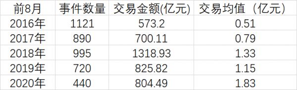 2020年前8个月,整个医疗行业的融资事件数量达440个,融资总金额达804.49亿元,单笔融资均值高达1.83亿元,为近五年同期最高。