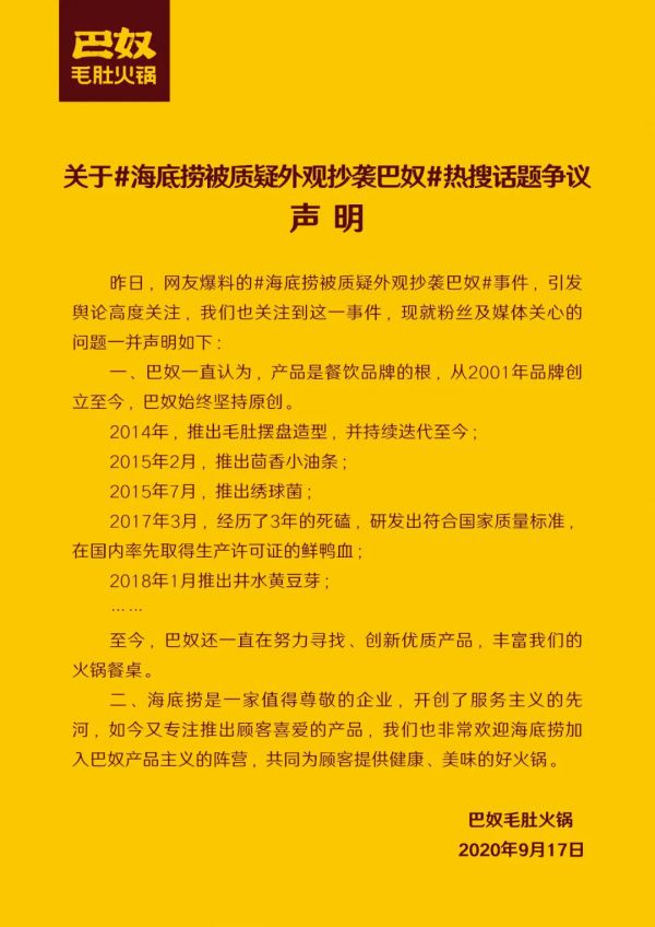 在外界议论纷纷时,9月17日,巴奴对此次涉嫌被抄袭事件进行了回应:“我们也非常欢迎海底捞加入巴奴产品主义的阵营,共同为顾客提供健康、美味的好火锅。”