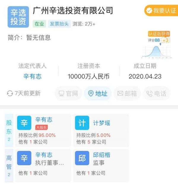 这笔投资大有来头。天眼查显示,辛选投资成立于2020年4月23日,注册资本1亿元,公司大股东为辛有志,也是为人熟知的“快手一哥”辛巴,总持股比例95%,同时担任公司执行董事兼总经理;计梦瑶持有5%的股份。