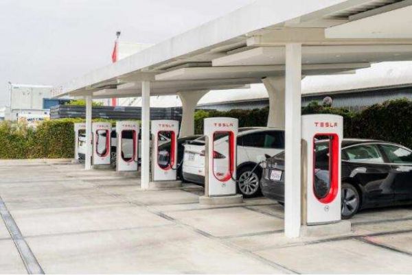 加州特斯拉设计中心的充电桩。欧盟有近20万个充电桩,而美国的数量还不到这个数字的一半