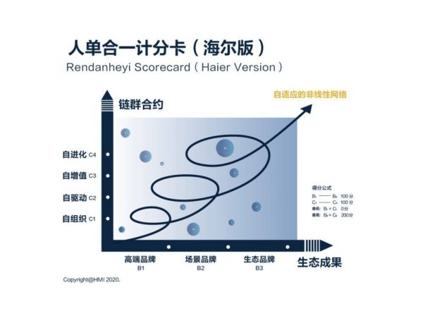 张瑞敏:其实是慢慢演变的过程,一开始没有想到。先是做“小微”,“小微”以后又做“链群”,哈佛商学院的教授告诉我,你说的听起来很美好,但是根本没法执行。这么多“小微”,你给他们很大的权力和自主性,自主创新性和目标统一性之间的张力怎么解决?“人单合一计分卡”的评价体系分为纵横两个维度和一个链接机制,纵轴四个刻度,分别是自组织、自驱动、自增值和自进化;横轴三个刻度,分别是高端品牌、场景品牌和生态品牌;纵横轴之间靠一个增值分享机制有机链接,并动态优化。人单合一计分卡的两个轴,纵轴颠覆了传统的组织,横轴颠覆了传统的市场。