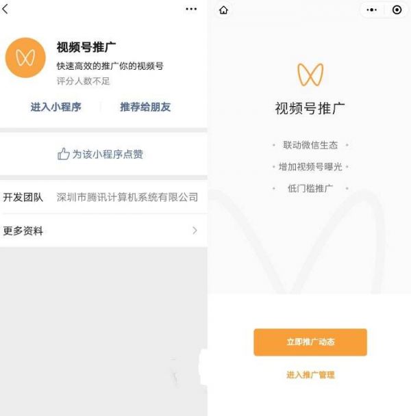 前两天,一个名为“视频号推广”的小程序在各大微信群疯传。这个小程序的开发主体为“深圳市腾讯计算机系统有限公司”,小程序首页介绍说“联动微信生活”、“增加视频号曝光”、“低门槛推广”,并设有“立即推广动态”和“进入推广管理”两个按钮。