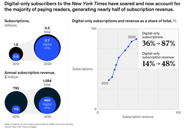 图注:《纽约时报》数字版读者飙升,在总订阅者中占比87%;数字版订阅收入占比接近总收入的一半(来源:McKinsey & Company)