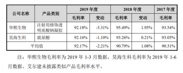 对此,爱美客解释称。2019年,注射用透明质酸钠产品适用增值税税率降低,产品不含税价格上升,同时原材料成本下降等原因下,毛利率水平提高了。但即便是退回到2018年,除爱芙莱外,其余多数产品的毛利率仍然在90%以上,综合毛利率达到89.34%。
