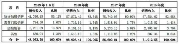 巴比食品招股说明书显示,报告期内其公司主营业务收入分为三部分:特许加盟销售、直营门店销售和团餐销售。其中特许加盟销售稳定发展,占比近90%;团餐的占比则提升迅速,2016年仅为3.76%,2019年上半年占比就超过了10%。