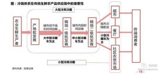 从招商证券整理的这个冷链体系可以看到,从生鲜离开种植(养殖)者之后,就一路有冷库冷藏,有各种型号的冷藏车运输,最终送到终端消费者的手中。