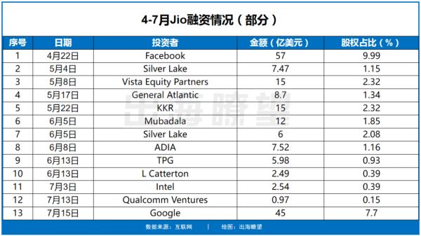 从4月起,Jio接连引来Facebook、英特尔、谷歌等科技巨头排队注资,短短几个月的时间,总投资额约200亿美元。