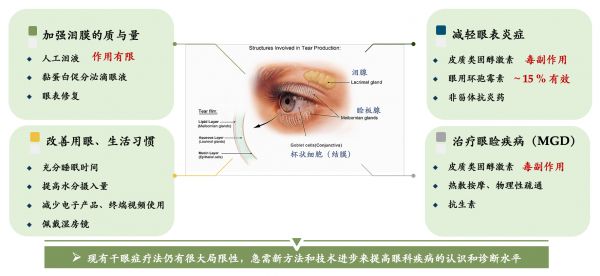 以干眼产品为例,随着现代社会生活的改变,临床对干眼诊断和治疗存在巨大的未满足需求。但由于干眼是病理机制不同的一类疾病,致病机理复杂多样,现有治疗方法局限性大。