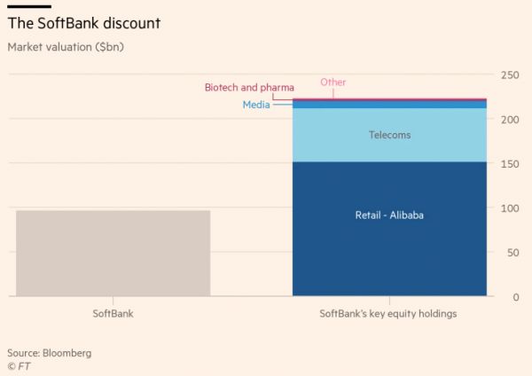 另外,由于大家认为孙正义可能是个疯子,所以软银的交易价格远低于其资产的账面价值。例比方说,在软银出售其在阿里巴巴的部分股份之前,所持的阿里巴巴股份的价值就超过了软银的全部市值。