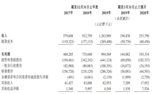2019年5月,明源软件正式更名为“明源云”,成为中国房地产开发商的第一大软件解决方案供应商。招股书显示,2017-2019年,明源云实现营收5.79亿元、9.13亿元、12.64亿元,毛利润分别为4.60亿元、7.36亿元、9.95亿元,复合年增长率为78.4%,毛利率高达79.4%、80.6%、78.7%。