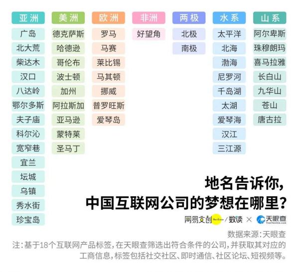 除此之外,不管是北极、南极,还是北美的波士顿、南非的好望角,都已经有了互联网公司的“身影”。楼兰、丝路、桃花源、巴比伦等词带有文化意向,也成了起名优选。