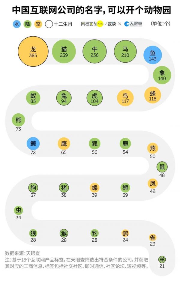 那么,从互联网公司的名字来看,哪些动物更受欢迎呢?派系显然较为复杂:有十二生肖属相,有“青龙、白虎、朱雀、玄武”四方神兽,当然更少不了猫狗之争。