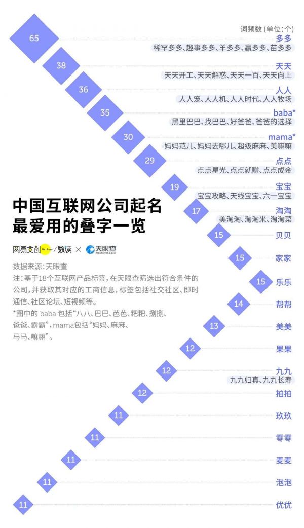 其中最受欢迎的是“多多”“天天”“人人”这样的百搭叠字。的确,谁不希望“稀罕多多”,可以“天天开工”,大步走向“人人时代”呢?