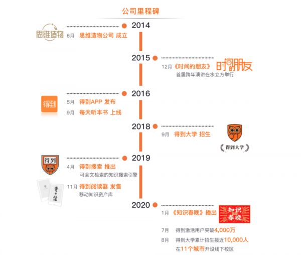 于2018年推出的“得到大学”,主要受众对象为职场人士,截至2010年3月31日,线下校区已经覆盖11个城市,开设85个班次,录取学员超过7000人;较为熟知的“跨年演讲及知识春晚”于每年12月31日至次年1月1日在一线城市举办,截至2020年3月31日,该演讲已经举办五届,现场参与人数累计超过4万人。