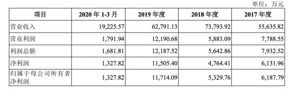 根据招股书信息,思维造物2017年、2018年、2019年和2020年一季度,公司营业收入分别为 55635.82 万元、73793.92 万元、62791.13 万元和 19225.57 万元,净利润分别为 6131.96 万元、4764.41 万元、11505.40 万元以及 1327.82 万元,扣非净利润则分别为4990.31万元、3280.95万元、3067.57万元和1309.65万元。