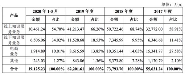 根据招股书信息显示,公司主要收入来源自知识付费,在各大业务收入占比中,知识服务业务收入占比近90%。值得注意的是,在线上知识服务贡献的收入中,2019年度下滑较为明显。“2019 年,公司线上知识服务业务及电商业务收入分别同比下降18.75%和16.77%。”招股书中写道。同时,电商业务在2019年也有所下滑,占比在2018年度为14.03%,2019年度则为13.85%。