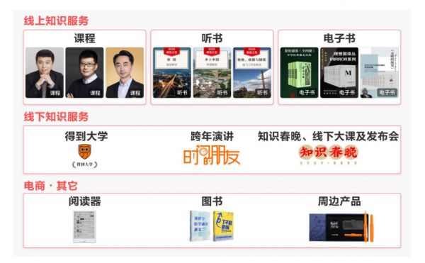 目前思维造物的业务包括线上和线下两部分。线上主要是“得到”App、“罗辑思维”微信公众号,提供课程、听书及电子书等产品。线下包括“得到大学”、“时间的朋友”跨年演讲、知识春晚等活动。