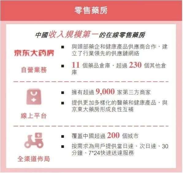 此外,京东健康的全渠道布局则指按需求为用户提供当日达、次日达、30分钟、7*24快速送达服务,现已覆盖超过200个城市。