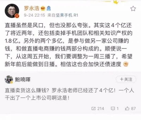 2020年9月24日,罗永浩在微博中再次澄清,表示“4个亿还了近两年,还包括卖掉手机团队和相关知识产权的1.8亿。”其余的部分,也不全是靠着直播电商赚到的,有一部分是“参与做另一家公司赚到的钱。”