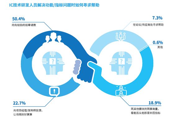 然而相较于欧美同行,中国集成电路开发群体受小作坊式思维影响较深,对产业生态合作重视程度不够。本次调研显示,当中国集成电路开发者“遇到功能/指标难题”时,超过90%会选择“在内部人员或固定小圈子处寻求帮助”,只有不足8%的人会考虑“在论坛或者供应商处寻求专业建议”。