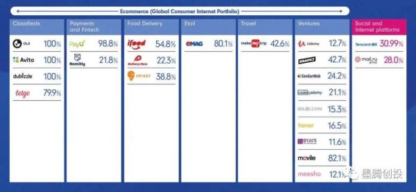拆分前和拆分后的Prosus近些年来积极在全球新兴市场进行多产业的布局,持续向电商,食品配送,远程教育,分类信息平台等领域投资数十亿美元,拥有近120亿美元的投资组合。