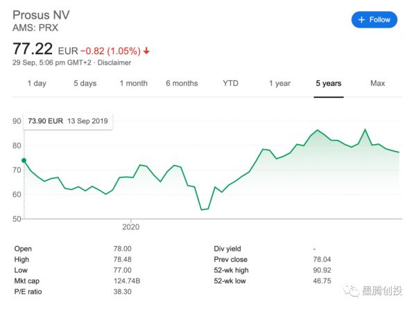 为了解决这个问题, 2019年9月11日,Naspers旗下分管互联网资产的子公司Prosus在荷兰阿姆斯特丹单独挂牌上市。在随后的几个交易日中,一举成为市值超过千亿美元的互联网巨头,这也是欧洲阴差阳错首次出现一家以互联网为核心业务且覆盖全球的企业。