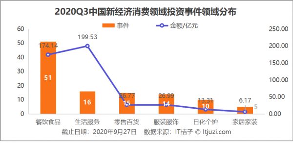 IT 桔子数据显示,2020 年 Q3 消费领域中,餐饮食品领域共计发生 47 起投资事件,交易金额超过 150 亿元。本季度典型包括白酒品牌「金徽酒」获得超过 7 亿战略投资;快餐品牌「麦堡王」完成 A 轮融资等。