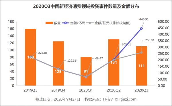 消费领域的动态也影响到消费领域的投资领域。IT 桔子数据显示,2020 年 Q3 中国新经济消费领域共计发生 111 起投资事件,同比下降 15%,涉及交易金额超过 400 亿元,同比增长 119%。(仅统计消费领域 ToC 方向的项目,B2B 等类型项目暂不统计)。其中,居民物业消费领域的恒大金碧物业获得战略投资 235 亿港元,是该季度消费领域交易金额最高的事件。排除极端值后,消费领域的投资金额同比增长 27%。