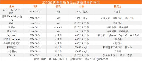 垂直领域中,2020 年 Q3 餐饮食品领域依然是消费领域最热门的赛道之一,健康类食品、咖啡品牌以及生鲜电商领域受到较多关注。IT 桔子数据显示,本季度健康食品领域中共计有 10 个品牌获得投资,包括植物肉品牌——星期零、Hey Maet、新素食,蛋白饮品品牌——荷乐士 honices、小麦欧耶燕麦奶以及代餐食品品牌 Wholly Moly! 好哩!、咚吃、丸今科技等。
