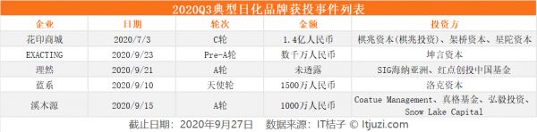 2020 年 Q3 值得注意的领域还有国产日化美妆领域。IT 桔子数据显示本季度共计有 7 个日化彩妆品牌获得投资。其中,国产美妆领域中,「完美日记」继 2020 年 4 月获得战略投资后,完成新一轮融资,此轮融资由华平投资、凯雷亚洲基金、正心谷创新资本参与,交易金额合计 1.4 亿美元。据悉,这或是完美日记赴美 IPO 前的融资。
