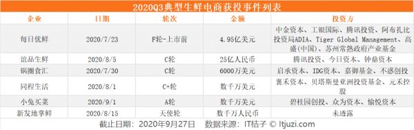 这种环境也造就了生鲜电商在 2020 年 Q3 强劲的表现。IT 桔子数据显示,2020 年 Q3 共有 5 家生鲜电商相关企业获得投资,包括每日优鲜、谊品生鲜、同程生活等。
