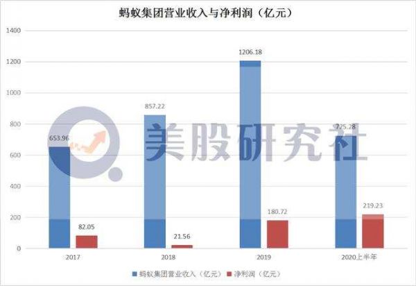 以蚂蚁金服为例,在营收上,2017年、2018年、2019年,2020年上半年蚂蚁集团分别实现营业收入653.96亿元人民币、857.22亿元人民币、1206.18亿元人民币、725.28亿元人民币。在净利润上,2017年、2018年、2019年和2020年1-6月蚂蚁集团分别实现净利润82.05亿元、21.56亿元、180.72亿元和219.23亿元。