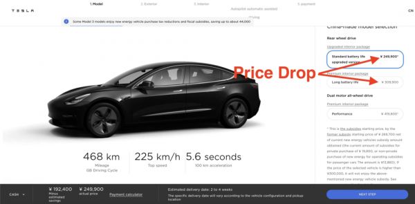 十一国庆,全国人民欢度双节的第一天,特斯拉官网显示,中国制造Model 3标准续航升级版补贴后售价为249900元,中国制造Model 3长续航后轮驱动版补贴后售价309900元。