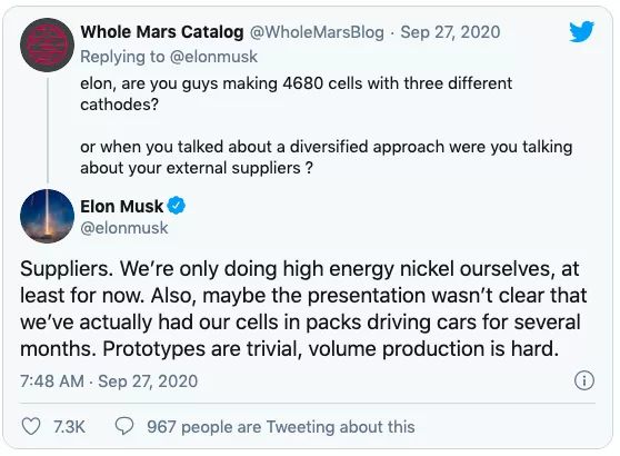 在他的推文中,装配了4680电池的原型车虽然已经在测试,但批量生产还有困难。他一再强调,对于任何制造商来说,最重要和最困难的测试是大规模生产,并对能够做到这一点的人表示深深的敬意。