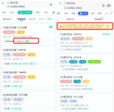 通过简单对比发现,对于同样的起点和终点,高德和百度地图推荐的前几种乘车路线是不太一样的。另外,在提供的信息细节上也不同:百度会给出最新的道路信息和骑行建议,而高德则更突出对要乘坐车辆的时间、满载率等信息。
