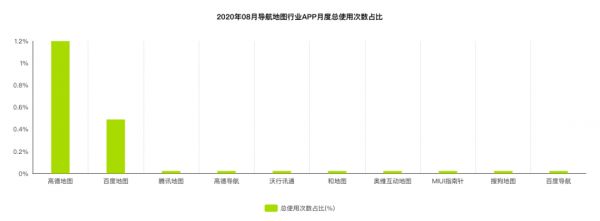 另一组数据显示,8 月份,高德地图在行业 App 中的使用次数占比达到了 1.2%,与去年 9 月份时 0.9% 的占比相比有了很大提升。而百度地图仅仅从去年 9 月份的 0.48% 涨至今年 8 月份的 0.49%,变化微乎其微。