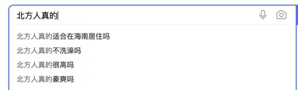 这种由饮食原教旨主义引起的争论,还只是南北方人各自倔强的一小部分。当你打开搜索引擎,输入“南/北方人真的……”,就会出现许多奇奇怪怪的问题联想,毫无疑问,这都是前人留下的搜索痕迹,带你推开南北方人差异的新世界大门。
