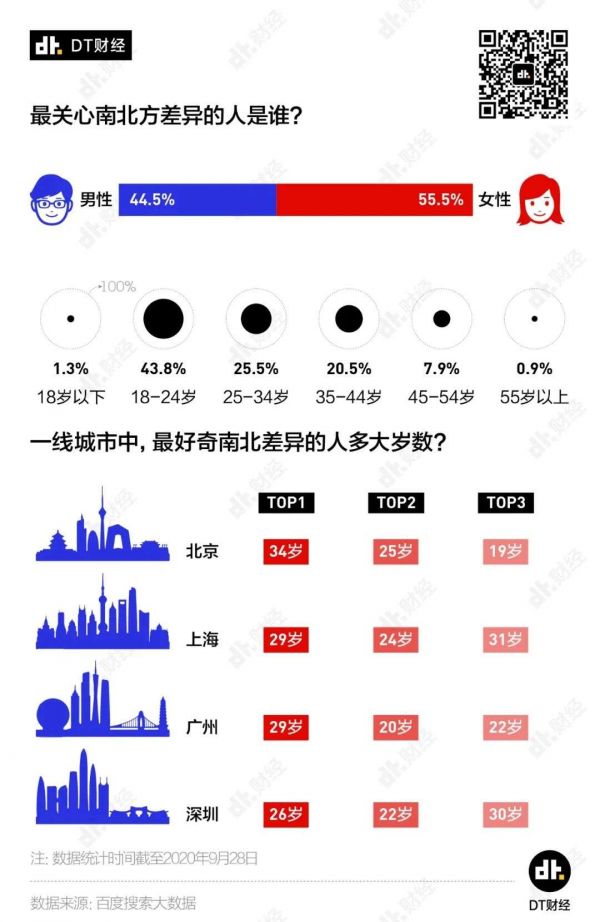 从年龄和性别来看,18-34岁的年轻人对南北差异的好奇心是最强的。女性似乎比男性更热衷于探索南北方的差异。