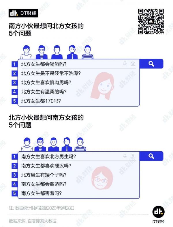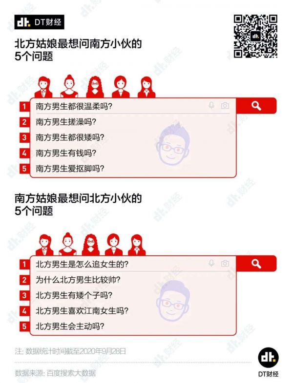 南方女孩提问最多的2个问题,分别是“北方男生是怎么追女生的”和“为什么北方男生比较帅”。