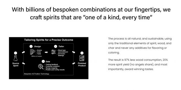 这家初创公司旨在尽量减少这些烈酒的陈化时间,该陈化过程通常是在木桶中完成的。「Bespoken Spirits」认为,传统的桶式陈化是一个浪费的过程,因为在这个过程中,酿酒厂会由于蒸发操作,损失大约 20% 的产品。因此,该公司将传统的过程与基于机器学习的方法相结合,并将其技术称为“ACTivation 技术”,其中 A、C 和 T 分别代表香气、颜色和味道。