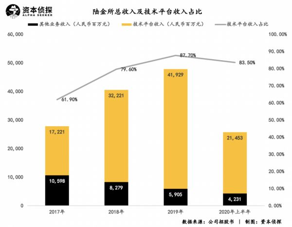 得益于如此大规模的客户群体,陆金所的收入连年增长,从2017年的278亿元增长至2019年的478亿元。其中,为小微企业主提供的信贷业务和为富裕群体提供的资产管理服务被划为技术型收益,占比由2017年的61.9%提升至2019年的87.7%,但今年上半年占比出现下滑。