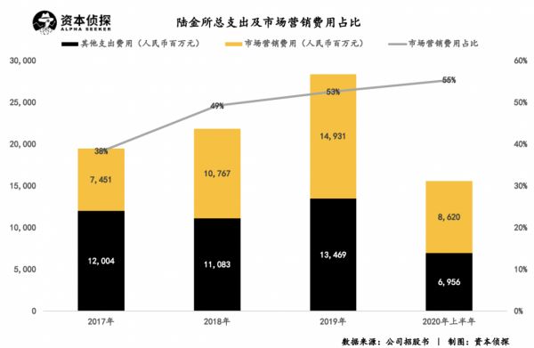 收入增长的另一面是技术及研发费用、运营及服务费用等支出也在攀升,其中市场营销费用逐渐占据主导,由2017年的38%升至2020年上半年的55%。