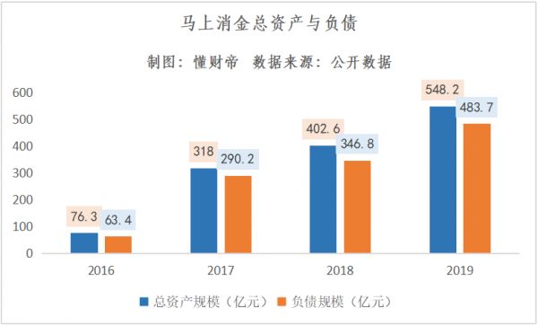 而这三年正是马上消费金融业务扩张最迅猛的时期。2016至2019 年,马上消金总资产从76.3亿暴增至548.2亿元。同期,马上消金营收分别为15.8亿、46.7亿、82.4亿和90亿元,净利润分别652万、5.8亿、8亿和8.53亿元。