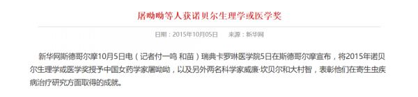 屠呦呦获2015年诺贝尔生理学或医学奖