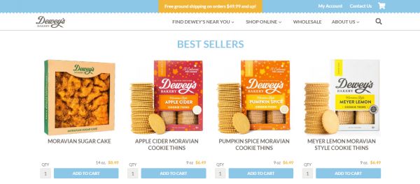 Dewey's Bakery 的摩拉维亚饼干,是一款超薄的曲奇,每块饼干的热量低于20卡;公司的咖啡蛋糕是用大量黄油、红糖和糖蜜烘焙而成;软烤饼干非常柔软且耐嚼,在当地面包店非常受欢迎。