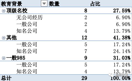 教育背景属于其他的,且没有知名公司经历的只有5人,其中4位都担任过公司高管,唯一不是高管的,是位转业军人,看照片至少是当过少校,公司已经IPO。