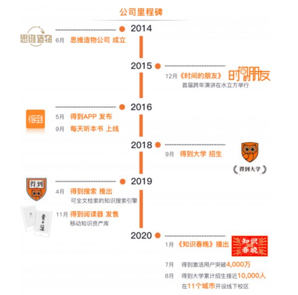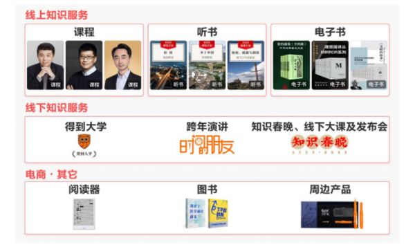 招股书显示,思维造物目前业务主要分为线上、线下。线上业务为“得到App”和“罗辑思维”微信公众号,线下业务则包括“得到大学”、“跨年演讲”等活动。