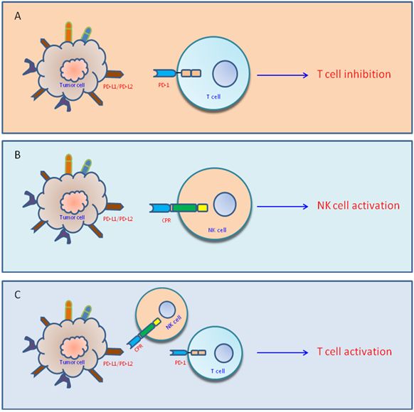 其中,靶激活NK细胞疗法可以针对靶点特异性的肿瘤细胞进行攻击,并最终把肿瘤细胞消灭掉。一种是表达特定CAR分子的NK细胞,可通过与肿瘤靶点的结合而激活NK细胞。另一种则表达嵌合PD1受体,通过两种途径发挥抗肿瘤效应,一种是通过与肿瘤细胞的PD-L1结合,激活NK细胞,同时可通过阻断PD-L1与患者自身T细胞PD-1的结合而激活T淋巴细胞,从而发挥抗肿瘤效应。